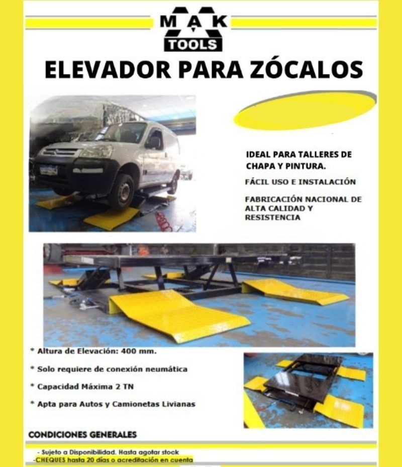 Ideal para talleres de chapa y pintura, con una capacidad de 2 toneladas, apta para autos y camionetas, y una altura de elevación de 40cm.